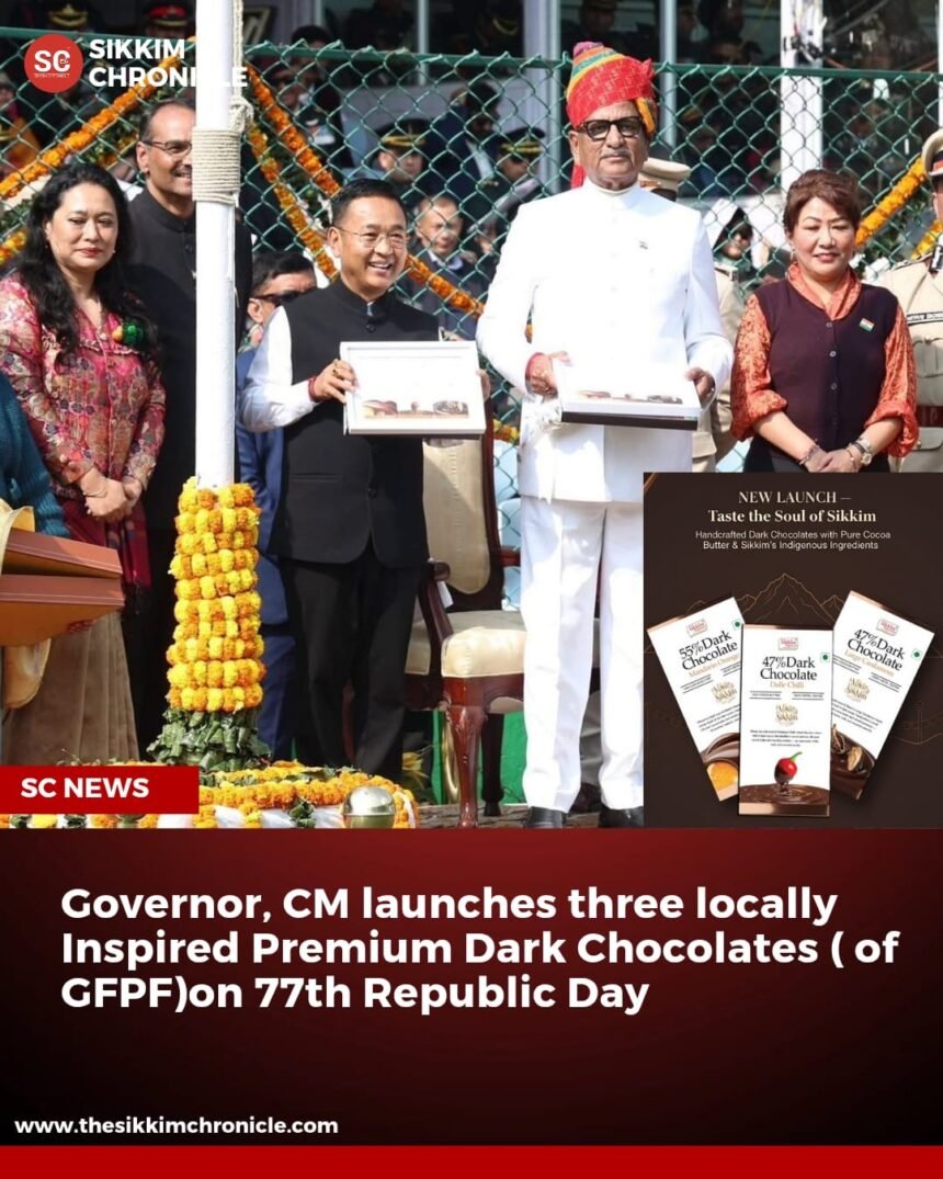 On the occasion of the 77th Republic Day of India and the historic milestone of 50 years of Sikkim’s Statehood the Government Fruit Preservation Factory (GFPF), under the Commerce & Industries Department, Government of Sikkim, officially launched three locally inspired premium dark chocolates, showcasing the state’s rich agricultural heritage and honouring the dedication of its farmers.