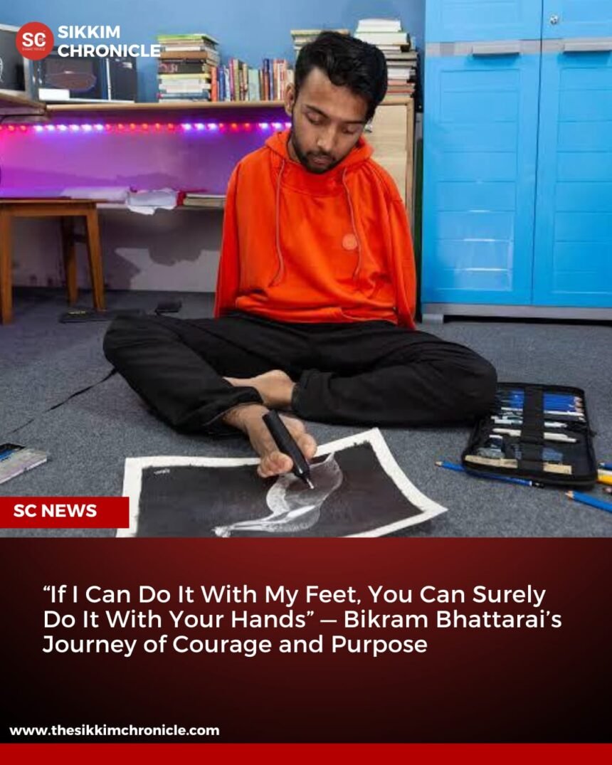 Gangtok: Born without arms, 23 year old Bikram Bhattarai from Gangtok, Sikkim, has emerged as a powerful symbol of resilience, determination, and inclusive potential. An accomplished artist, history graduate, National Awardee, and the PwD State Icon of Sikkim, Bikram’s life journey stands as a compelling reminder that physical limitations do not define human capability.