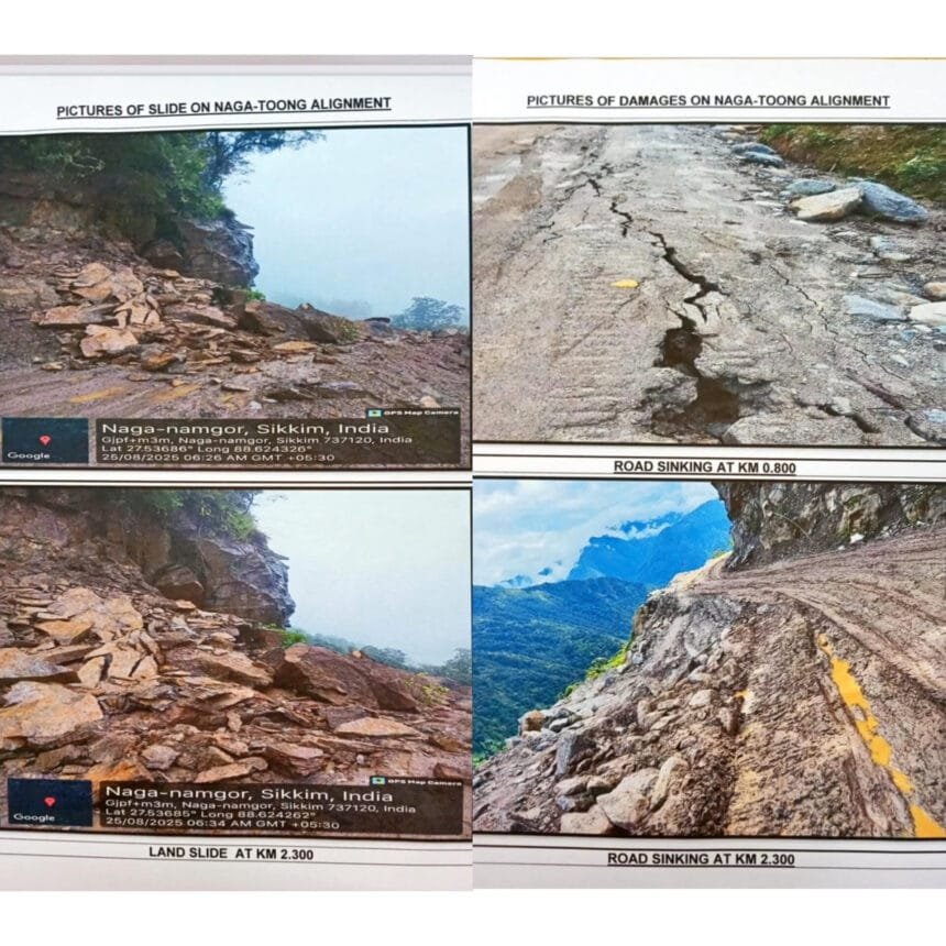 Mangan, August 25: The Toong-Naga stretch of the Mangan-Chungthang highway has been closed for all traffic after the road was found sinking at several locations, accompanied by multiple landslides.