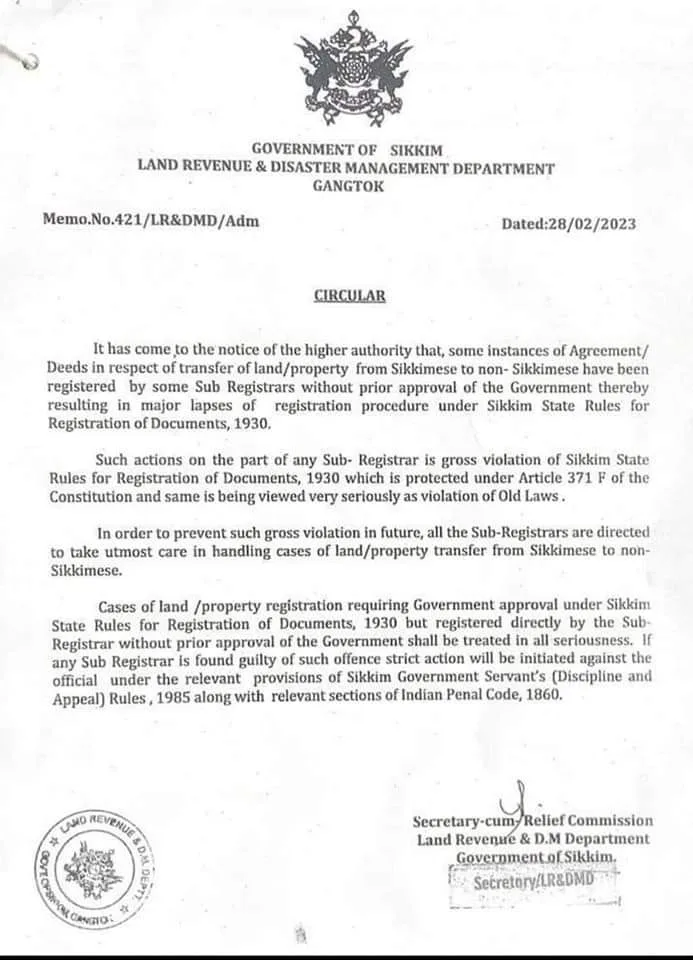 Department of Land Revenue and Disaster management through circular dated February 28 stated, “It has come to the notice of the higher authority that, some instances of Agreement/ Deeds in respect of transfer of land/property from Sikkimese to non- Sikkimese have been registered by some Sub Registrars without prior approval of the Government thereby resulting in major lapses of registration procedure under Sikkim State Rules for Registration of Documents, 1930.”