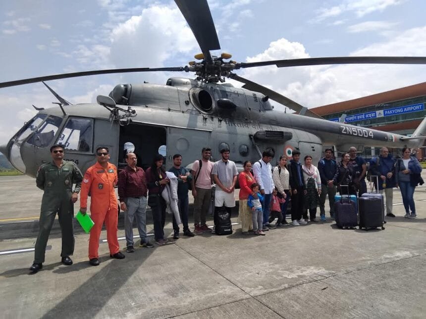 Pakyong, June 5 (IPR): In a continued effort to rescue tourists stranded due to inclement weather and challenging terrain, the second batch of tourists has been successfully airlifted from Chaten to Pakyong Greenfield Airport today.