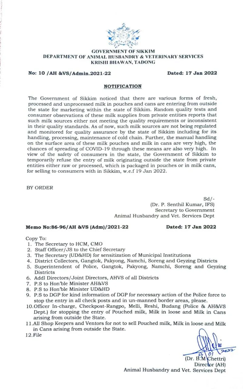 “Government of Sikkim to temporarily refuse the entry of milk originating from outside the state due to the report of random testing which states that the milk sources are inconsistent in their quality standards and requirements.” Reads the notification issued by Department of Animal Husbandry and Veterinary Services