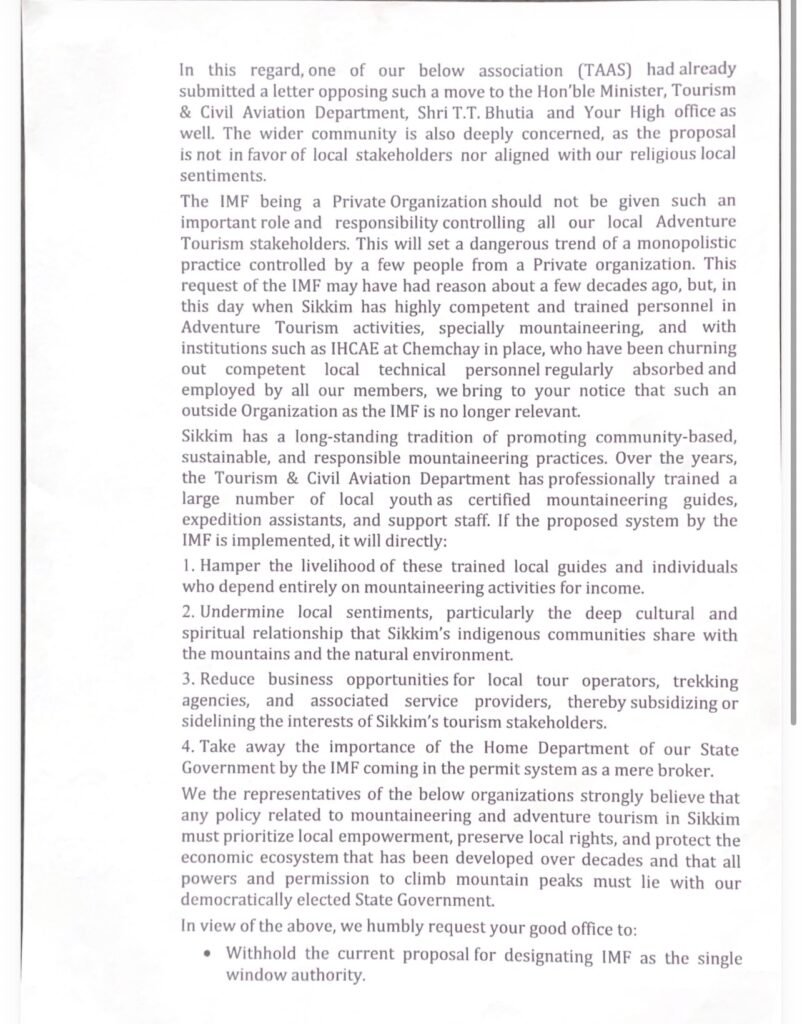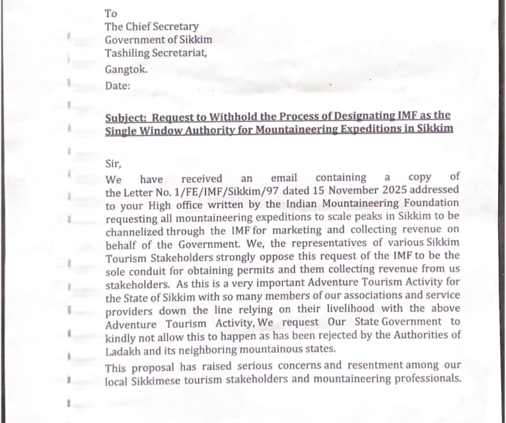In a joint representation submitted to the Chief Secretary, Government of Sikkim, the stakeholders strongly opposed a letter issued by the IMF on November 15, 2025, proposing that all mountaineering expeditions in Sikkim be routed through the foundation for marketing and revenue collection on behalf of the government.