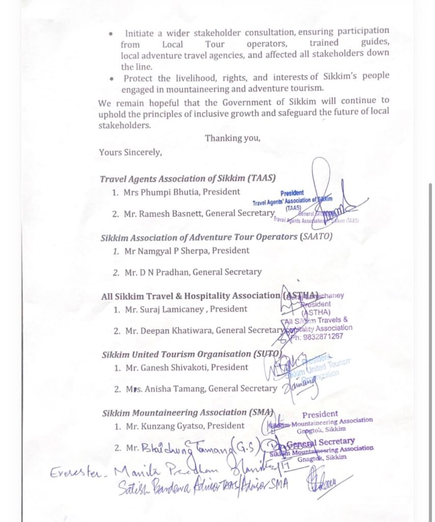 The letter was jointly signed by representatives of the Travel Agents Association of Sikkim (TAAS), Sikkim Association of Adventure Tour Operators (SAATO), All Sikkim Travel & Hospitality Association (ASTHA), Sikkim United Tourism Organisation (SUTO), and the Sikkim Mountaineering Association (SMA).